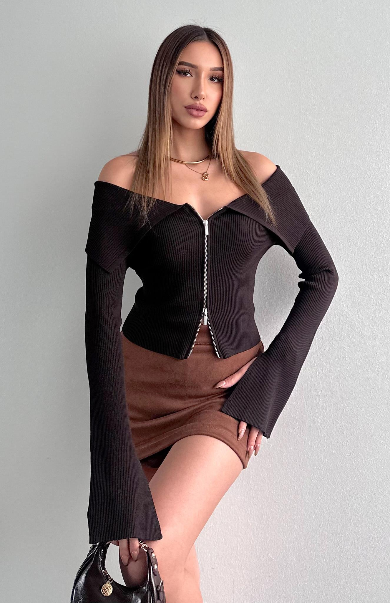 Barkot Yaka Kol Yırtmaç Detaylı Fermuarlı Hırka KAHVERENGİ