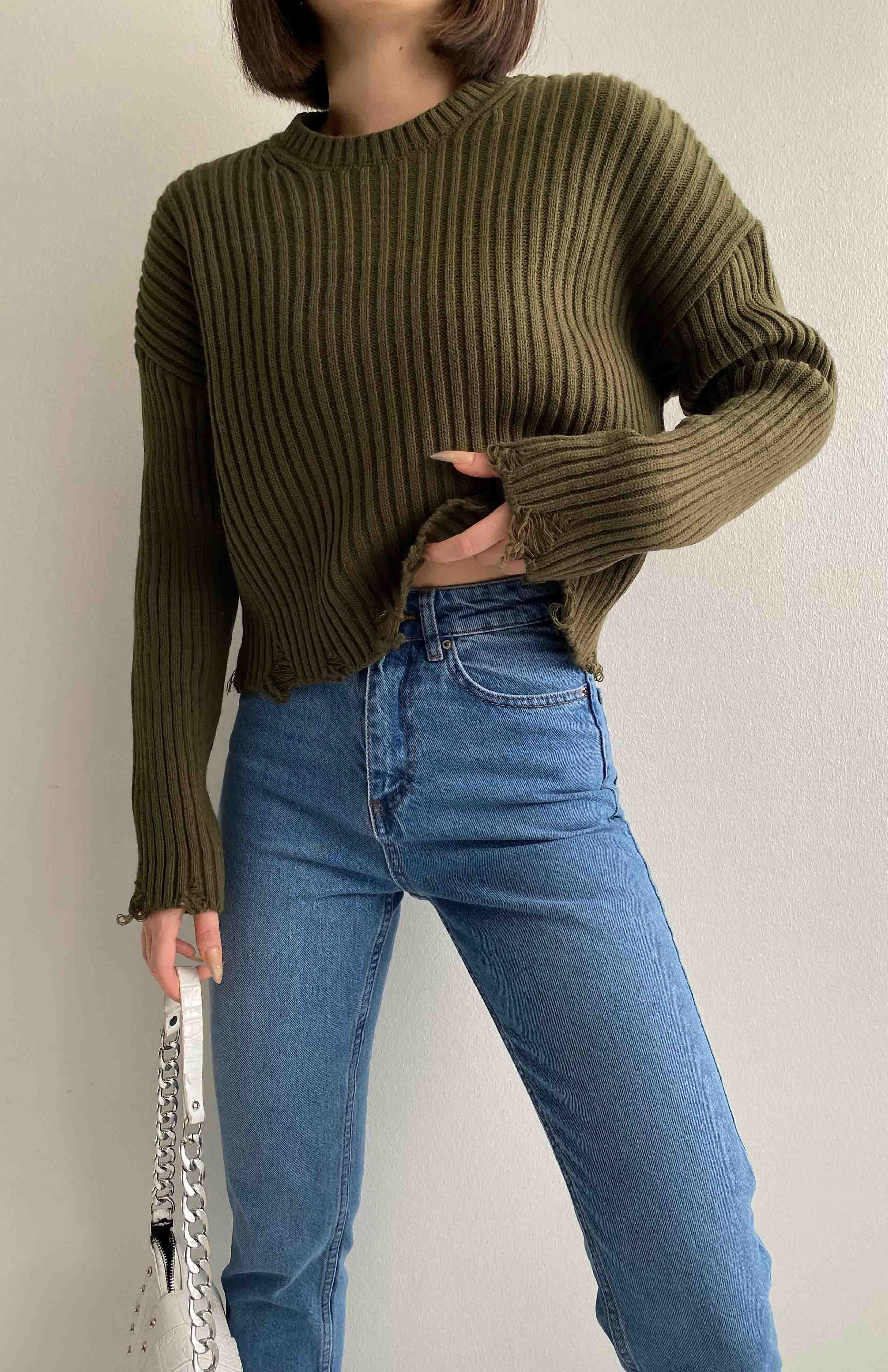 Bisiklet Yaka Altı Yırtıklı Kazak HAKİ (108-1955)