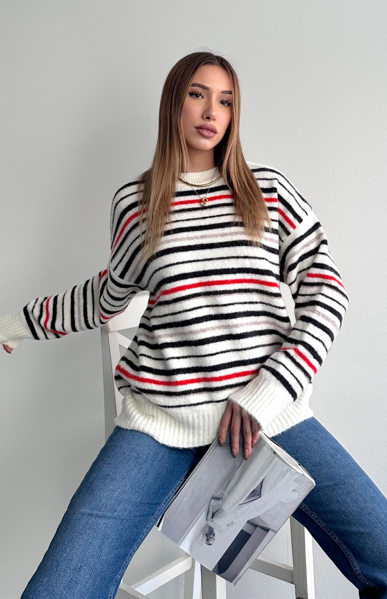Çok Renkli Çizgili Oversize Kazak EKRU (108-2524)