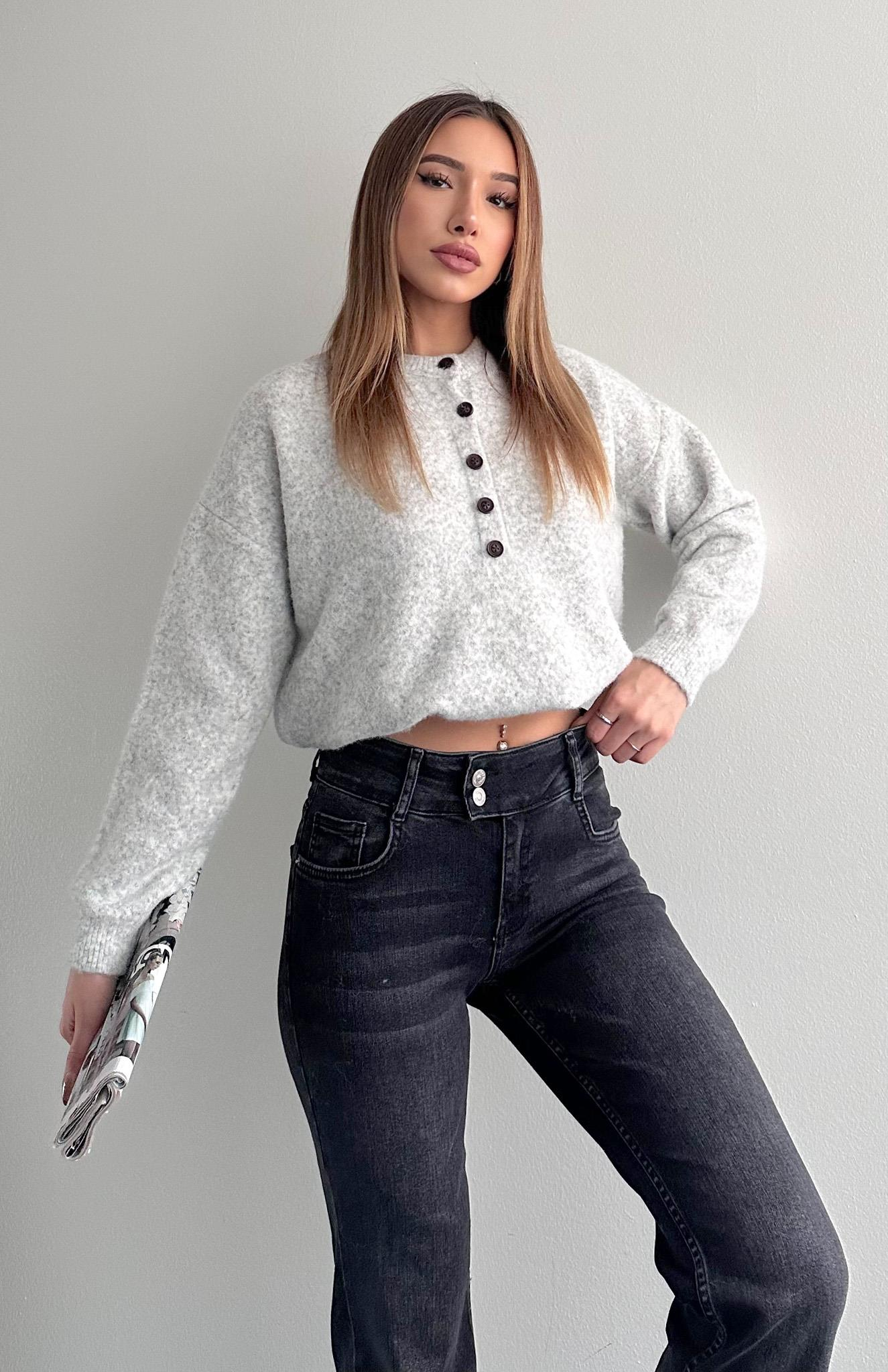 Düğmeli Açık Yaka Kazak GRİ