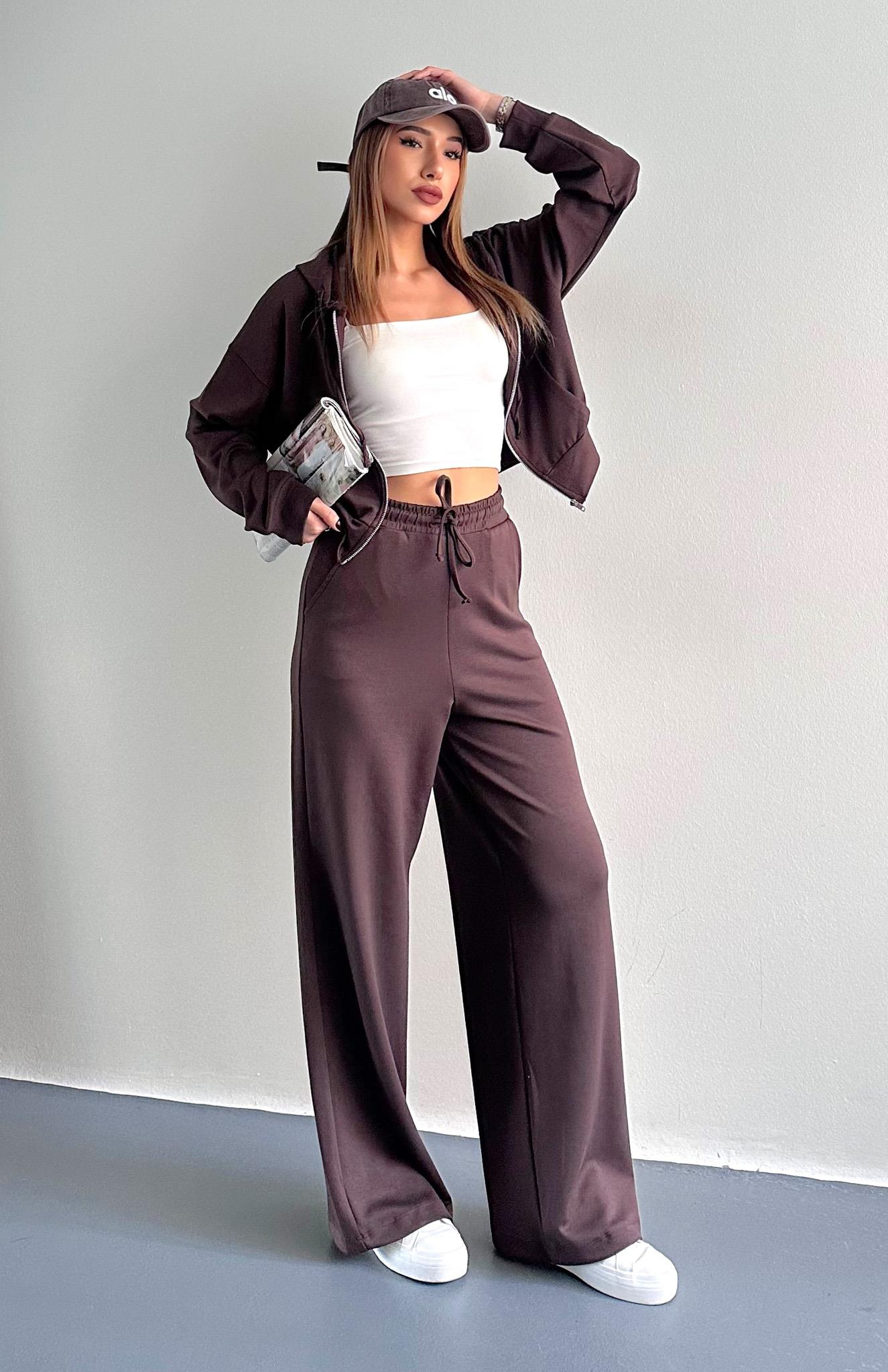 Kapşonlu Fermuarlı Pantolon Modal Takım KAHVERENGİ