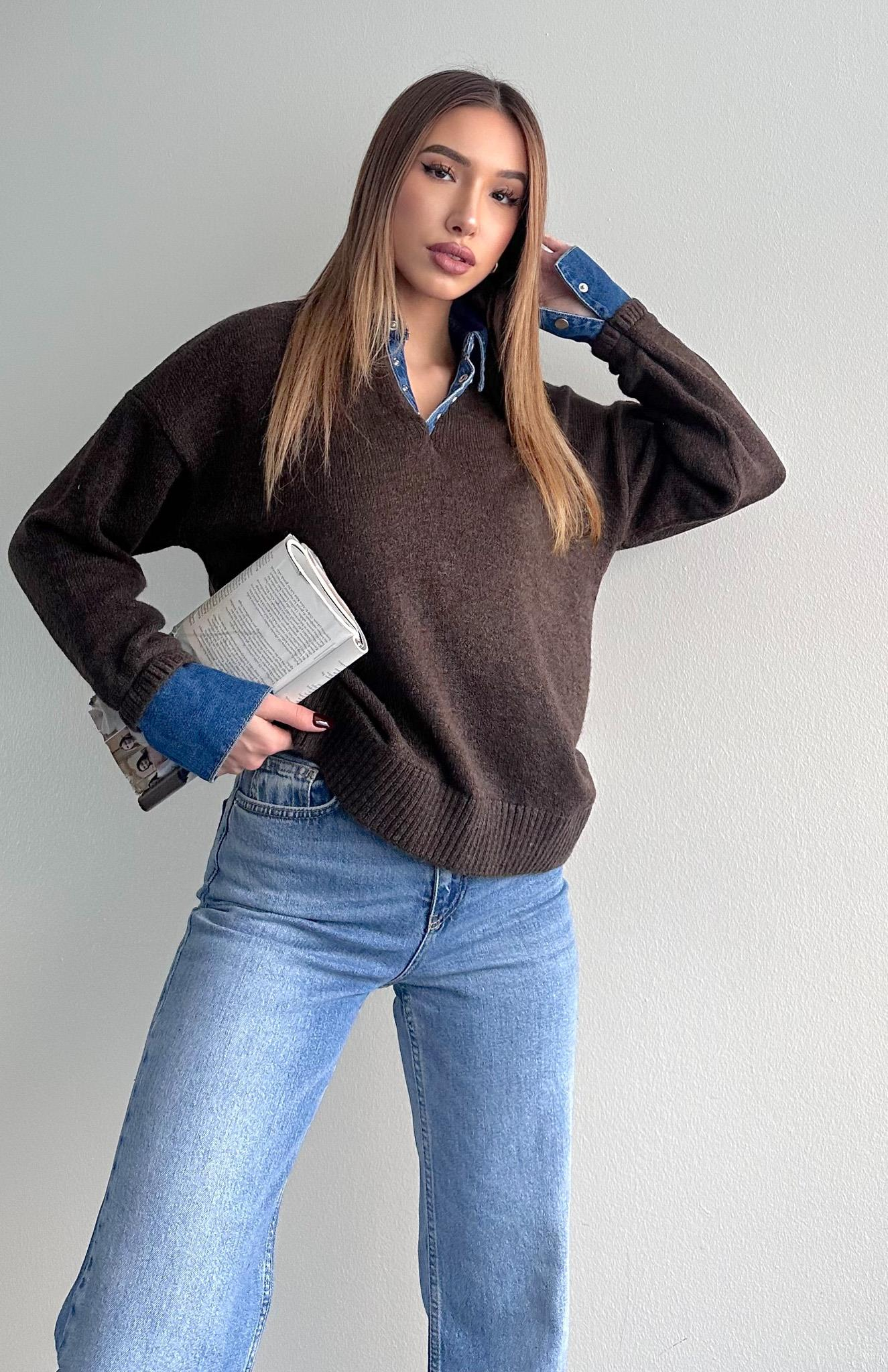 Yakası Kot Kazak Kahve-mavi (066-TK251099)